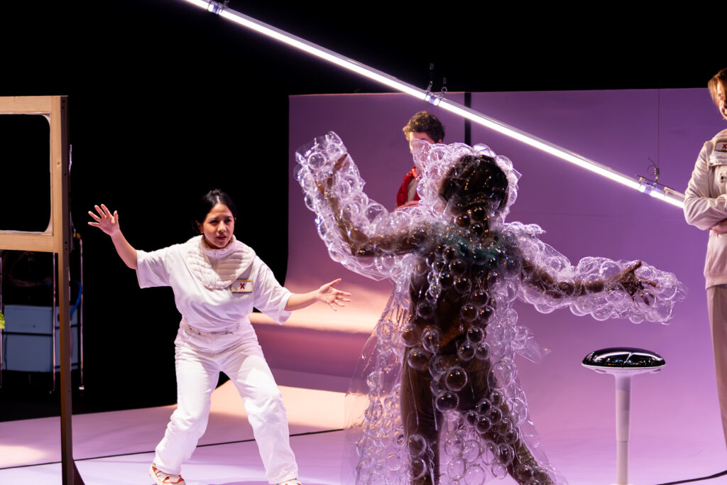 宇宙を漂いながら、やがて言葉をめぐる対話が繰り広げられます。劇中で語られる、変化しゆく「わたしたちの言葉」とは、いったい誰のものなのか。舞台上で発されるせりふが、その発音や文法の「正しさ」とは関係なく観客に届くということ。パフォーマンスが引き起こす想像を拠り所に、「正しさ」から解放された言葉が作用し、演劇の本質があらわになっていきます。
