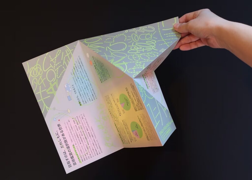 配信作品のみならず制作のプロセスや事業の意義についても広く周知するため、音声ガイドやバリアフリー字幕、手話の制作プロセスや完成版に対するフィードバックなどを紹介する記事を発信しました。また、より広い層に情報を届けるため、SNS広告の出稿も行なっています。加えて、舞台芸術関係者向けのパンフレットも作成。福祉ではなく文化芸術の側からバリアフリーに取り組むことの重要性を紹介することを目的に、ユニバーサルデザインに関心の高いデザイナー・桑田知明氏にご協力いただき、仕掛けのある折り加工を施したパンフレットを作成・配布しました。